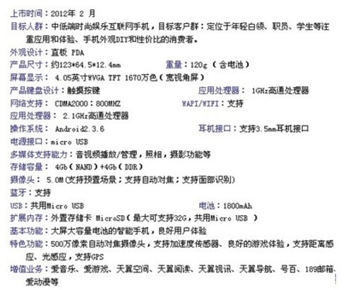 E188的外形采用DIY的设计,看上去非常的时尚。该机的屏幕尺寸为4.0英寸,使用的材质为TFT。该机为1GHz高通处理器,运行Android 2.3的系统非常的流畅。这款手机的摄像头像素为500万。